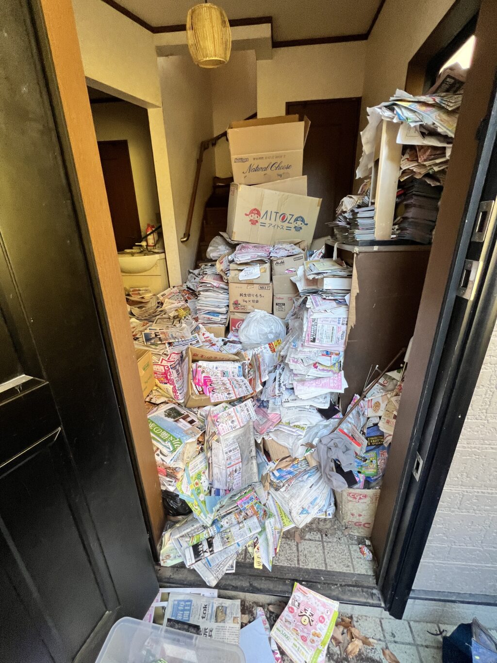 [玄関・廊下・階段下] 玄関を開けた瞬間から、廊下を埋め尽くすほどの新聞紙、チラシ、雑誌の束が目に飛び込んできました。階段下のスペースも完全に「物置」と化しており、奥にあるものを取り出すのは不可能な状態です。