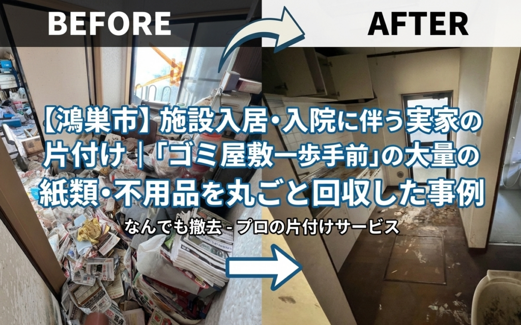 【鴻巣市】施設入居・入院に伴う実家の片付け|「ゴミ屋敷一歩手前」の大量の紙類・不用品を丸ごと回収した事例
